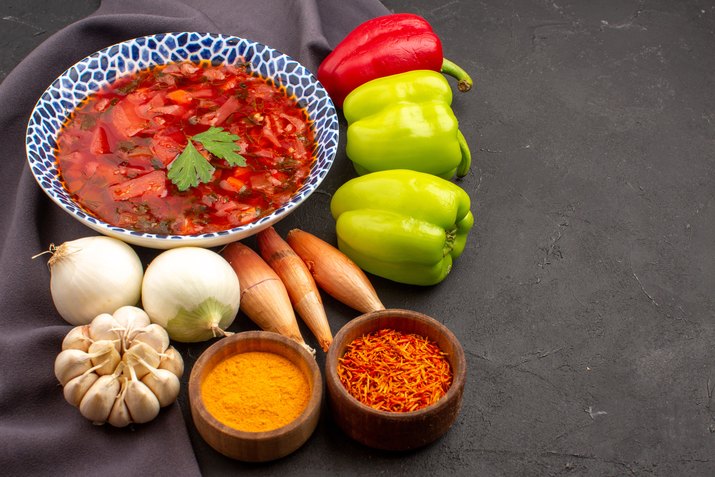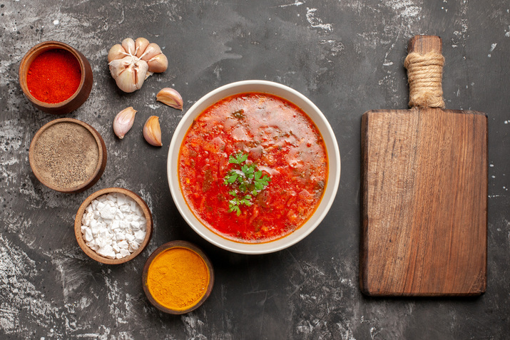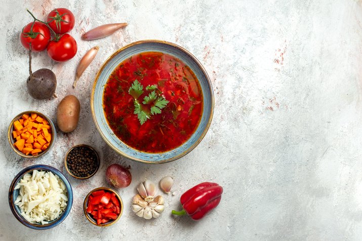 Борщ с томатной пастой получается ярким и ароматным! Благодаря говяжьему бульону вкус этого блюда будет насыщенный, но в зависимости от личных предпочтений можно использовать и другие виды мяса: курицу, индейку, свинину или даже крольчатину.